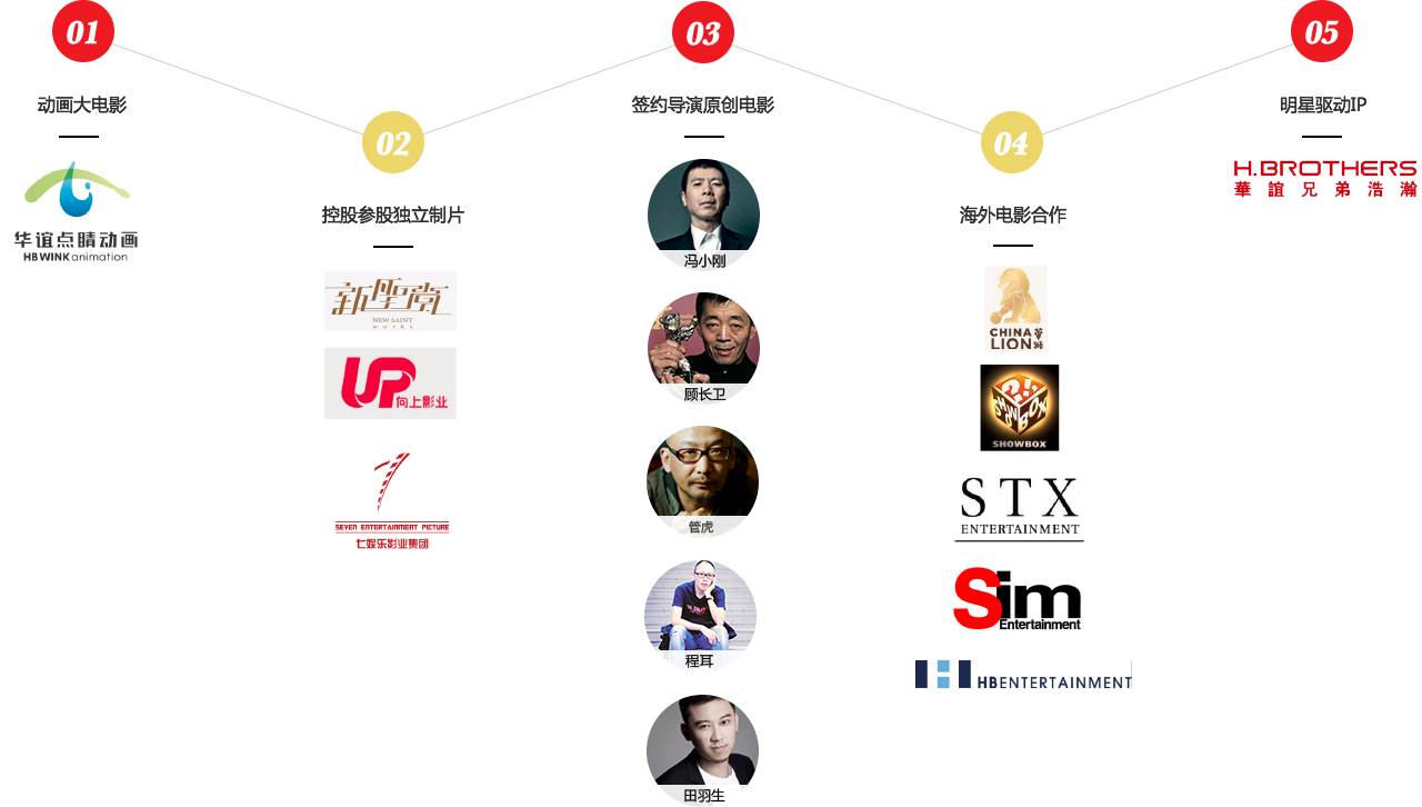 浩瀚娱乐、首页-盛煌平台-「品质引领发展,专注成就未来」聚星、东阳美拉和首页-盛煌平台-「品质引领发展,专注成就未来」点睛动画等;以及产量、品质都非常稳定的签约导演团队,如冯小刚、管虎、程耳和田羽生等等。